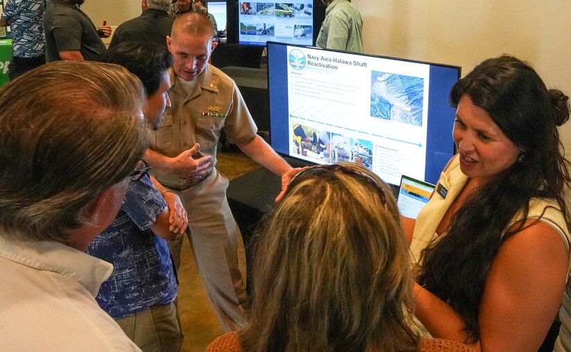 Members of Navy Closure Task Force-Red Hill (NCTF-RH) speak with community members about the reactivation of the Navy Aiea-Halawa Shaft Reactivation during the NCTF-RH open house held at the Oahu Veterans Center in Honolulu, Aug. 20, 2025. The quarterly open house focused on tank cleaning operations, Tank Closure Plan Supplement 4, environmental remediation and monitoring, and reactivation of the Navy Aiea-Halawa Shaft. Charged with the safe decommissioning of the Red Hill Bulk Fuel Storage Facility (RHBFSF), NCTF-RH was established by the Department of the Navy as a commitment to the community and the environment. The Navy continues to engage with the people of Hawaii, regulatory agencies, and other stakeholders as NCTF-RH works to safely and deliberately decommission the RHBFSF. (U.S. Navy photo by Mass Communication Specialist 1st Class Glenn Slaughter)