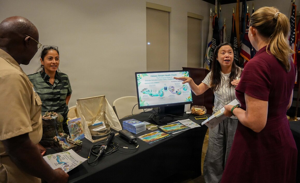 Capt. Gregory deWindt, chief of staff, Navy Closure Task Force-Red Hill (NCTF-RH), and Meagan Ostrem, community engagement director, NCTF-RH, speak with representatives from the University of Hawaii about the university’s independent Halawa Stream ecological monitoring studies during the NCTF-RH open house held at the Oahu Veterans Center in Honolulu, Dec. 11, 2025. NCTF-RH hosted the quarterly open house for members of the community to learn about current and future efforts in support of the Red Hill Bulk Fuel Storage Facility (RHBFSF) decommissioning and the Navy’s ongoing environmental efforts. NCTF-RH was established by the Department of the Navy to safely decommission the RHBFSF and emphasize the Navy's commitment to the community and the environment. NCTF-RH continues to engage with the people of Hawaii, regulatory agencies, and other stakeholders as it safely and deliberately decommissions the facility. (U.S. Navy photo by Mass Communication Specialist 1st Class Glenn Slaughter)