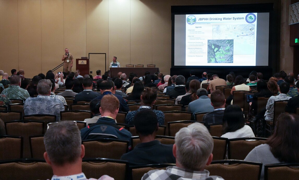 Cmdr. Benjamin Dunn, deputy for environment and remediation, Navy Closure Task Force-Red Hill (NCTF-RH), speaks about restoring resiliency to the Joint Base Pearl Harbor-Hickam drinking water system during the American Water Works Association’s 2026 Pacific Water Conference in Honolulu, Hawaii, Feb. 12, 2026. Charged with the safe decommissioning of the Red Hill Bulk Fuel Storage Facility (RHBFSF), NCTF-RH was established by the Department of the Navy as a commitment to the community and the environment. The Navy continues to engage with the people of Hawaii, regulatory agencies, and other stakeholders as NCTF-RH works to safely and deliberately decommission the RHBFSF. (U.S. Navy photo by Mass Communication Specialist 1st Class Glenn Slaughter)
