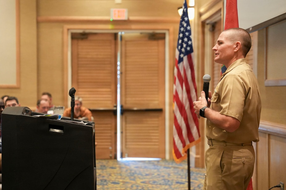 Cmdr. Benjamin Dunn, deputy for environment and remediation, Navy Closure Task Force-Red Hill (NCTF-RH), speaks at a Society of American Military Engineers luncheon in Honolulu, March 11, 2026. Charged with the safe decommissioning of the Red Hill Bulk Fuel Storage Facility (RHBFSF), NCTF-RH was established by the Department of the Navy as a commitment to the community and the environment. NCTF-RH continues to engage with the people of Hawaii, regulatory agencies, and other stakeholders as it safely and deliberately decommissions the facility. (U.S. Navy photo by Mass Communication Specialist 2nd Class Krystal Diaz)