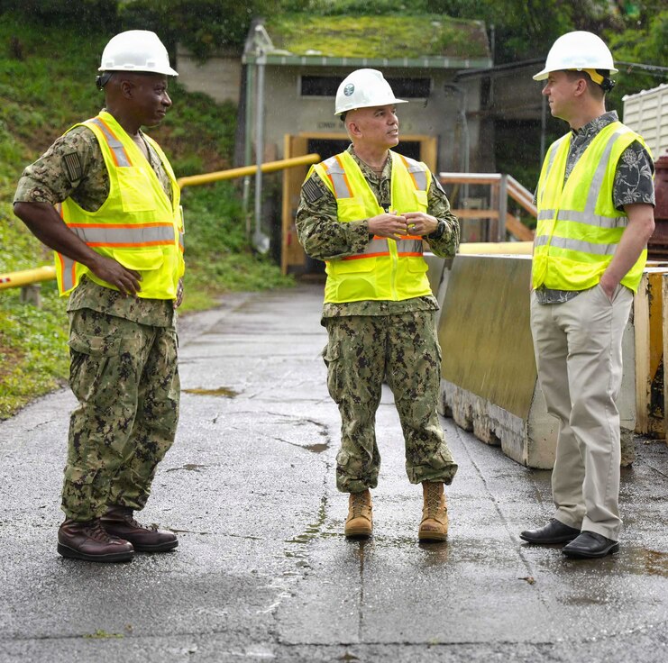 From left to right, Capt. Gregory deWindt, chief of staff, Navy Closure Task Force-Red Hill (NCTF-RH), Rear Adm. Lester Ortiz, deputy commander, NCTF-RH, and Tim Nelson, chief of staff for Hawaii Congressional Rep. Ed Case, speak during a site visit to the Red Hill Bulk Fuel Storage Facility (RHBFSF) in Honolulu, Hawaii on Feb. 20, 2026. Charged with the safe decommissioning of the facility, NCTF-RH was established by the Department of the Navy as a commitment to the community and the environment, and continues to engage with the people of Hawaii, regulatory agencies, and other stakeholders as it safely and deliberately decommissions the RHBFSF. This photo has been altered for security purposes. (U.S. Navy photo by Mass Communication Specialist 1st Class Glenn Slaughter)