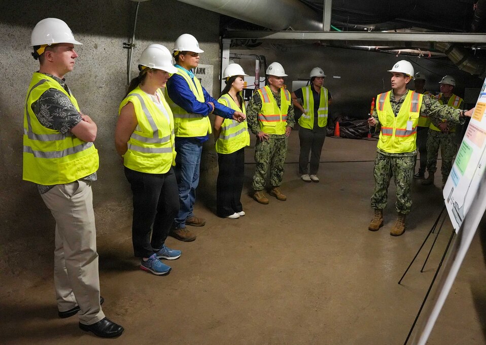 Capt. Robert Kleinman, decommissioning director, Navy Closure Task Force-Red Hill (NCTF-RH), explains the tank cleaning process to Tim Nelson, chief of staff for Hawaii Congressional Rep. Ed Case, during a site visit to the Red Hill Bulk Fuel Storage Facility (RHBFSF) in Honolulu, Hawaii, Feb. 20, 2026. Charged with the safe decommissioning of the facility, NCTF-RH was established by the Department of the Navy as a commitment to the community and the environment, and continues to engage with the people of Hawaii, regulatory agencies, and other stakeholders as it safely and deliberately decommissions the RHBFSF. (U.S. Navy photo by Mass Communication Specialist 1st Class Glenn Slaughter)